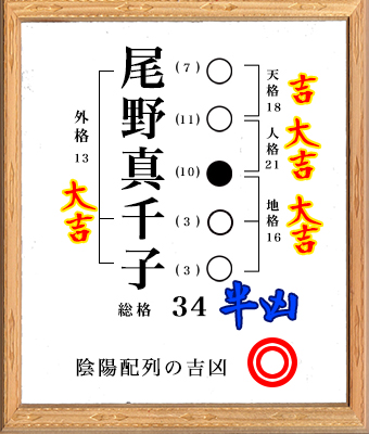 上の分析チャートを見ての通り尾野真千子という名前は、まず陰陽配列が良く、精神バランスも安定していて非常に性格の良い方だと推測されます。若い頃の運勢も成熟運も揃って大吉という運勢、社会運・家族運まで大吉となると彼女の運勢はずば抜けて良いのです。ところがひとつだけ総合運のみ“半凶”と出ているのでこの要素の作用がどうなっているかを詳しく斬ってみたいと思います。
