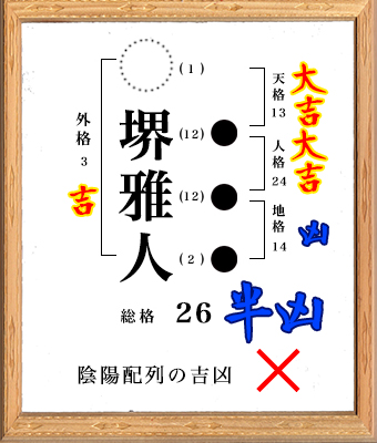陰陽配列が全て陰なので、良くない配列になっています。また、堺雅人というお名前は総格も半凶ですので、波乱の人生を歩むことになるでしょう。地格が凶ですので、若年期の運勢も悪いです。しかし、人格が大吉ですので、30歳以降の運勢はとても良いものとなっています。