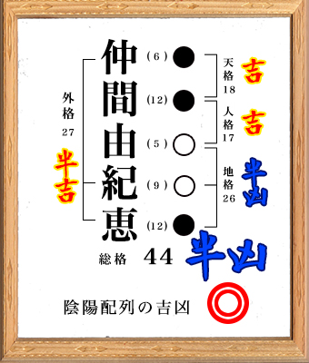 しかし、生涯運を司る総格が半凶になっており、44画という凶数を持つため、家庭崩壊の凶相を持っています。44画の画数を持つ人は逆上しやすいので、冷静さが必要でしょう。また、社会福祉の仕事をすることで運勢が開けるようになるでしょう。